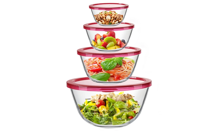 Nesting bowls with lids for baking, serving, and storage. Oven-safe glass design for versatile kitchen use