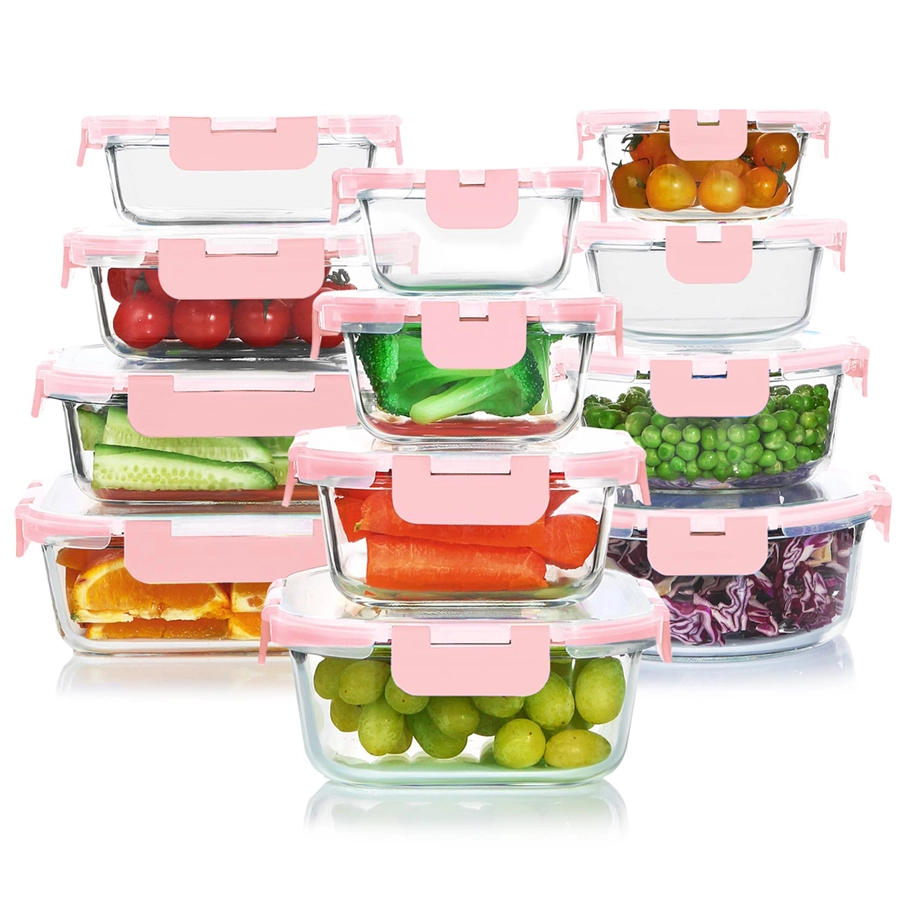 KOMUEE 10 Pack Glass Food Storage Containers, Meal Prep Containers with Lids, Airtight Glass Lunch Boxes, Freezer, Oven, and Microwave Safe(10-Pack Pink)