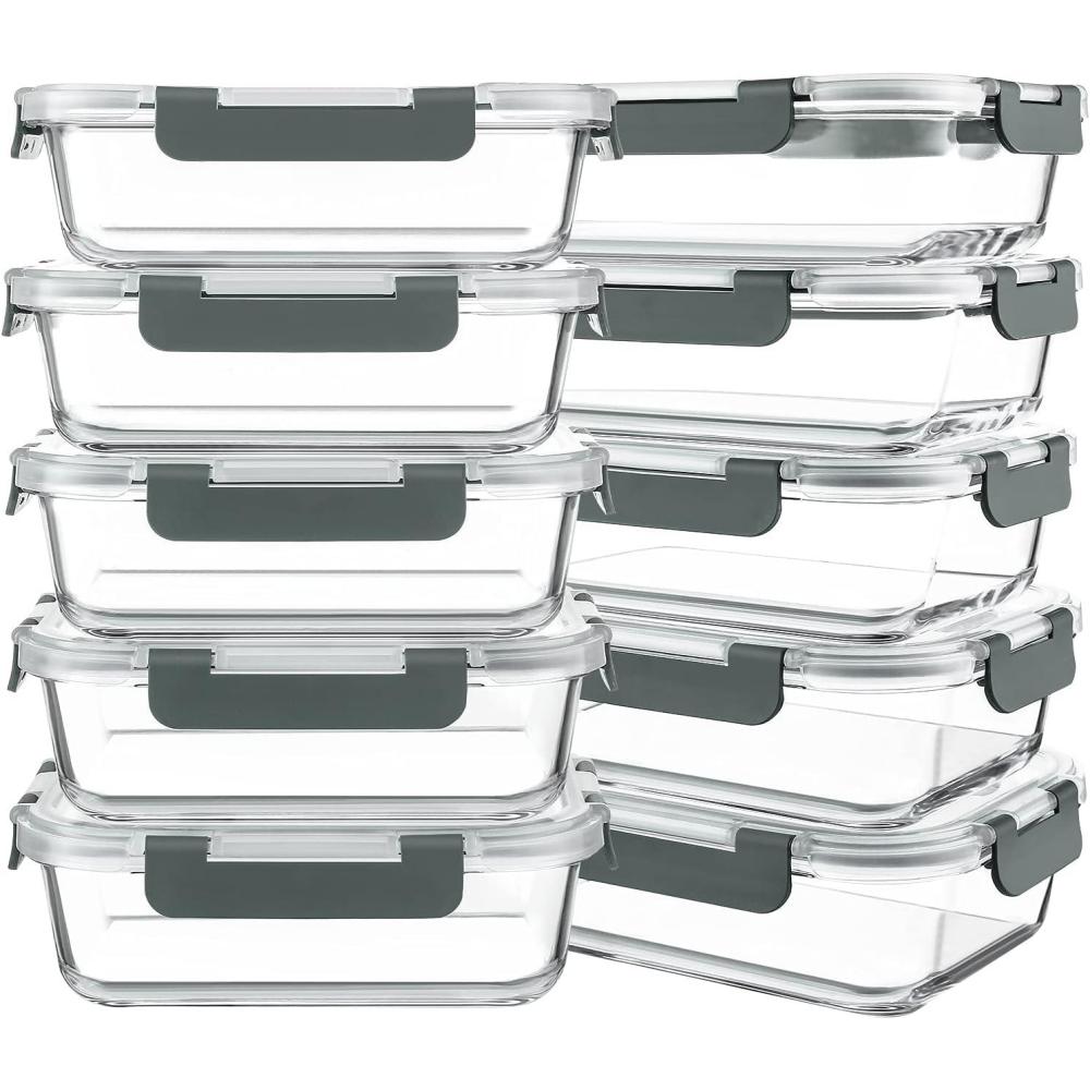 KOMUEE 10 Packs 30 oz Glass Meal Prep Containers,Glass Food Storage Containers with Lids,Airtight Glass Lunch Bento Boxes,Microwave, Oven, Freezer and Dishwasher,White(Gray)