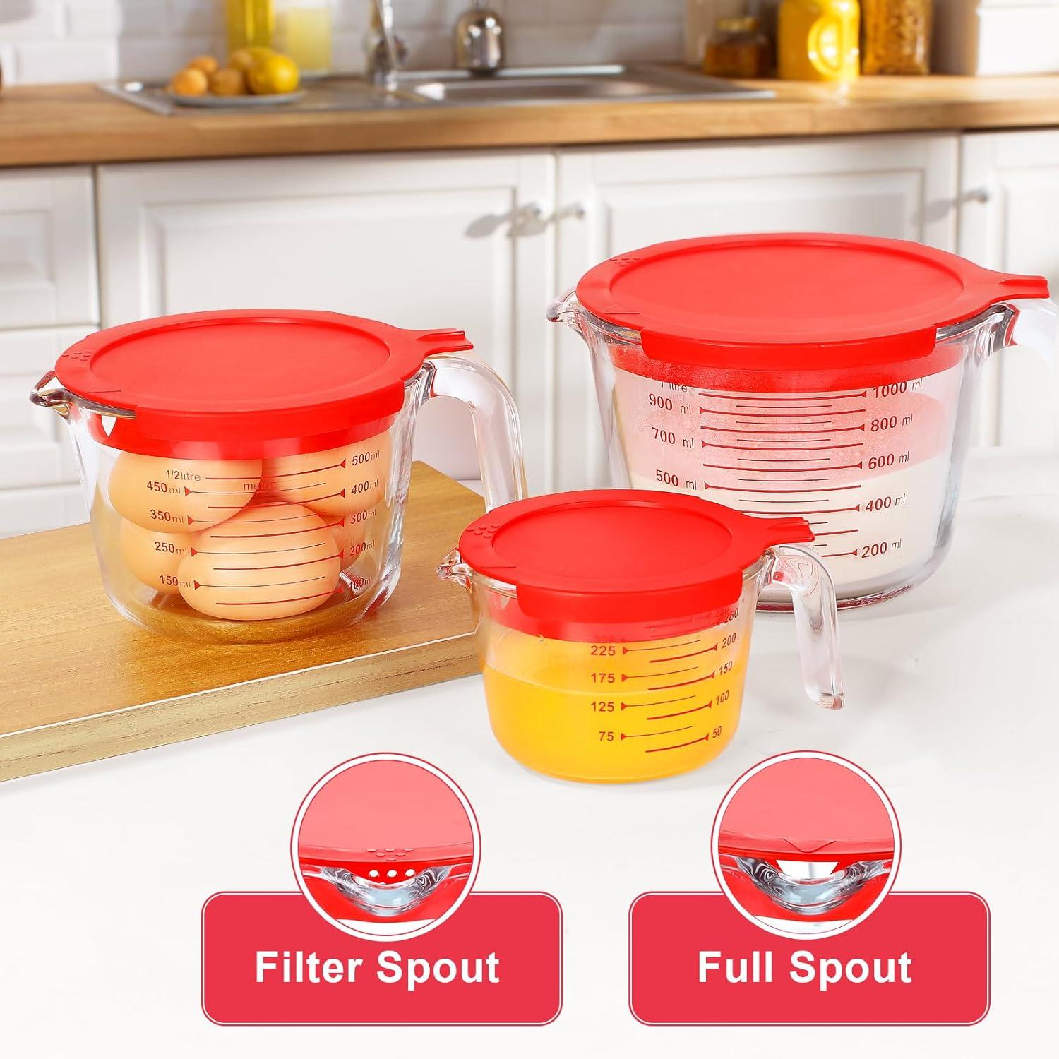 CONVENIENT LIDS: The included plastic lid for each glass measuring cup adds convenience to your cooking process. It helps to filter, keeps your ingredients protected, and allows for easy storage.