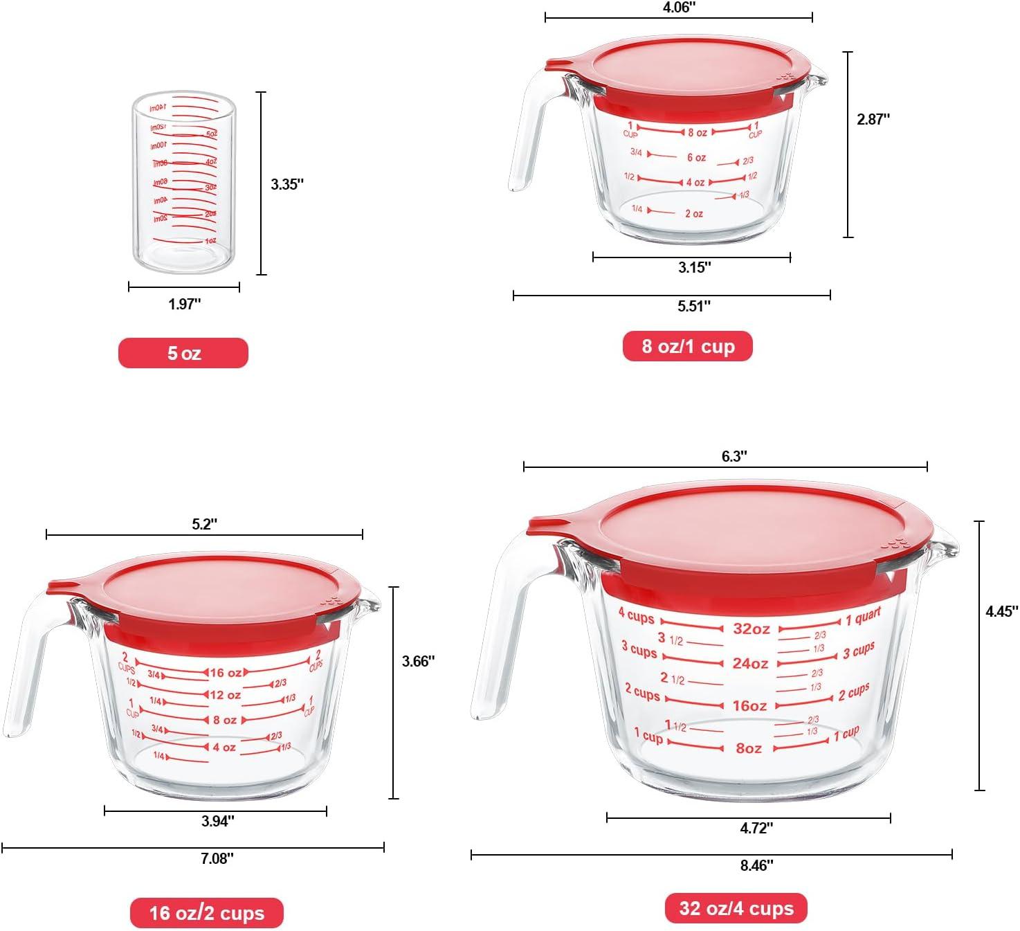 ESSENTIAL KITCHEN TOOL: This set of glass measuring cups with lids includes sizes of 5 ounces, 1 cup, 2 cups, and 4 cups, great for your cooking, baking and mixing needs.